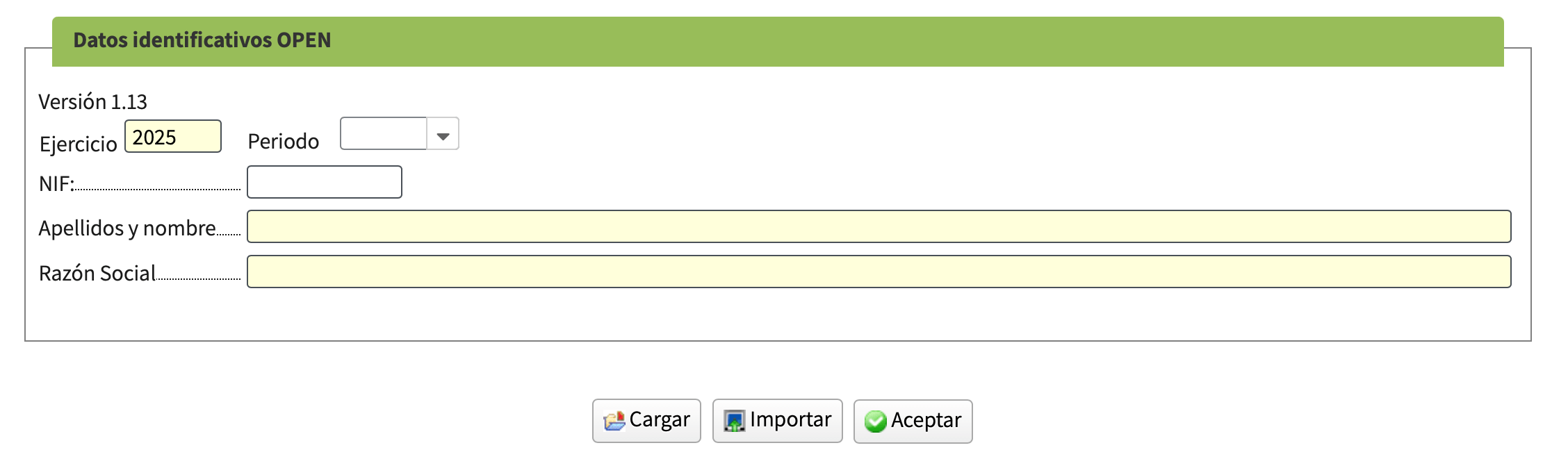 Pantalla inicial: datos de identificación