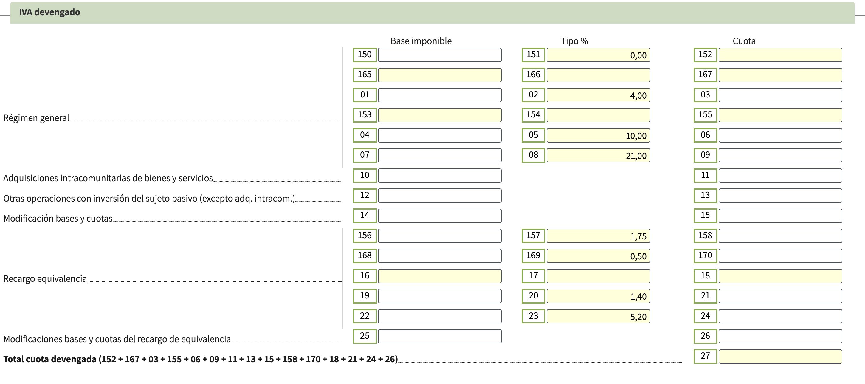 - Casillas 01, 02, 03 son para la tasa superreducida del 4%, que se aplica a cosas como pan y libros. Esto es poco frecuente en el caso de los proveedores de servicios.