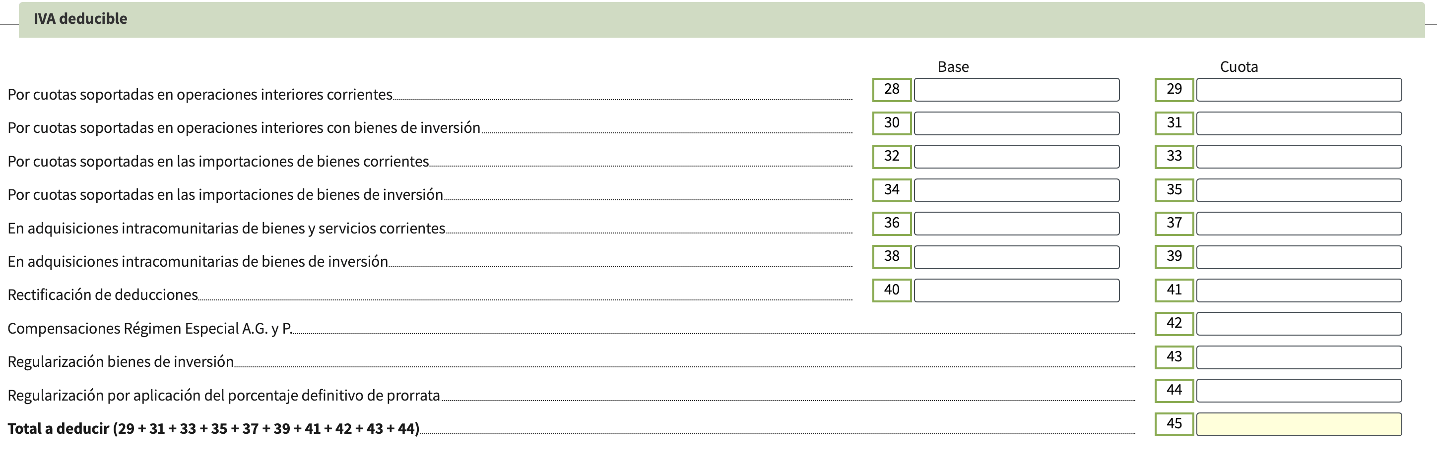- Casillas 28 y 29 son para gastos corrientes, es decir, el IVA sobre los gastos diarios, como material de oficina, software, servicios profesionales, teléfono e Internet. La casilla 28 es el importe base y la casilla 29 es el IVA deducible.