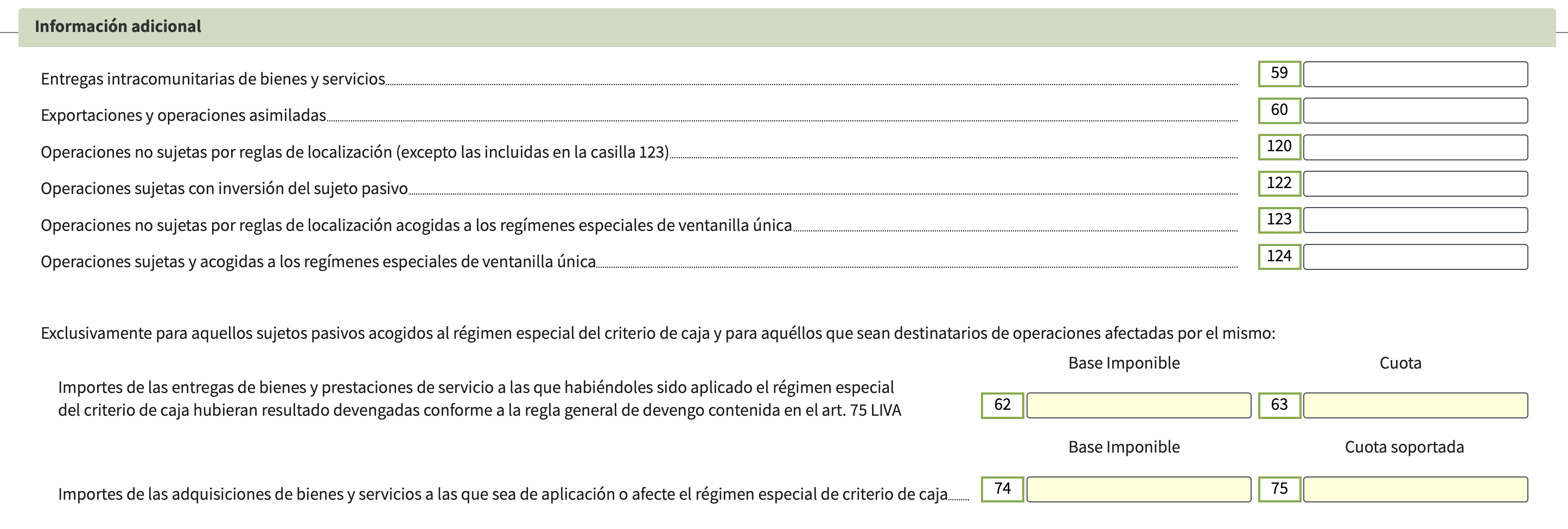 Puede ignorar la inversión sujeto pasivo en la casilla 122, que cubre casos específicos dentro de España. La OSS/Ventanilla única de las casillas 123-124 solo se aplica si vendes a consumidores finales de la UE. El criterio de caja que figura en las casillas 62, 63, 74 y 75 solo es importante si ha optado por ese régimen.